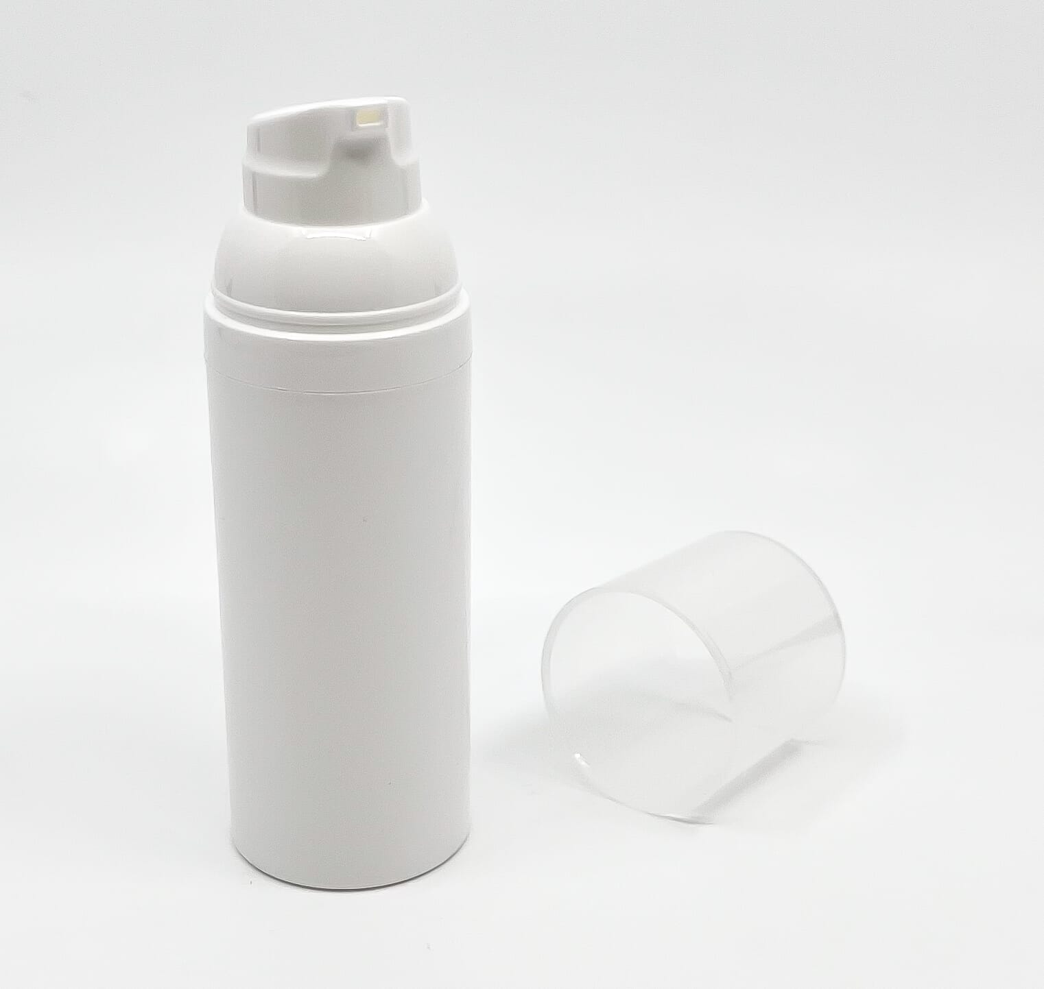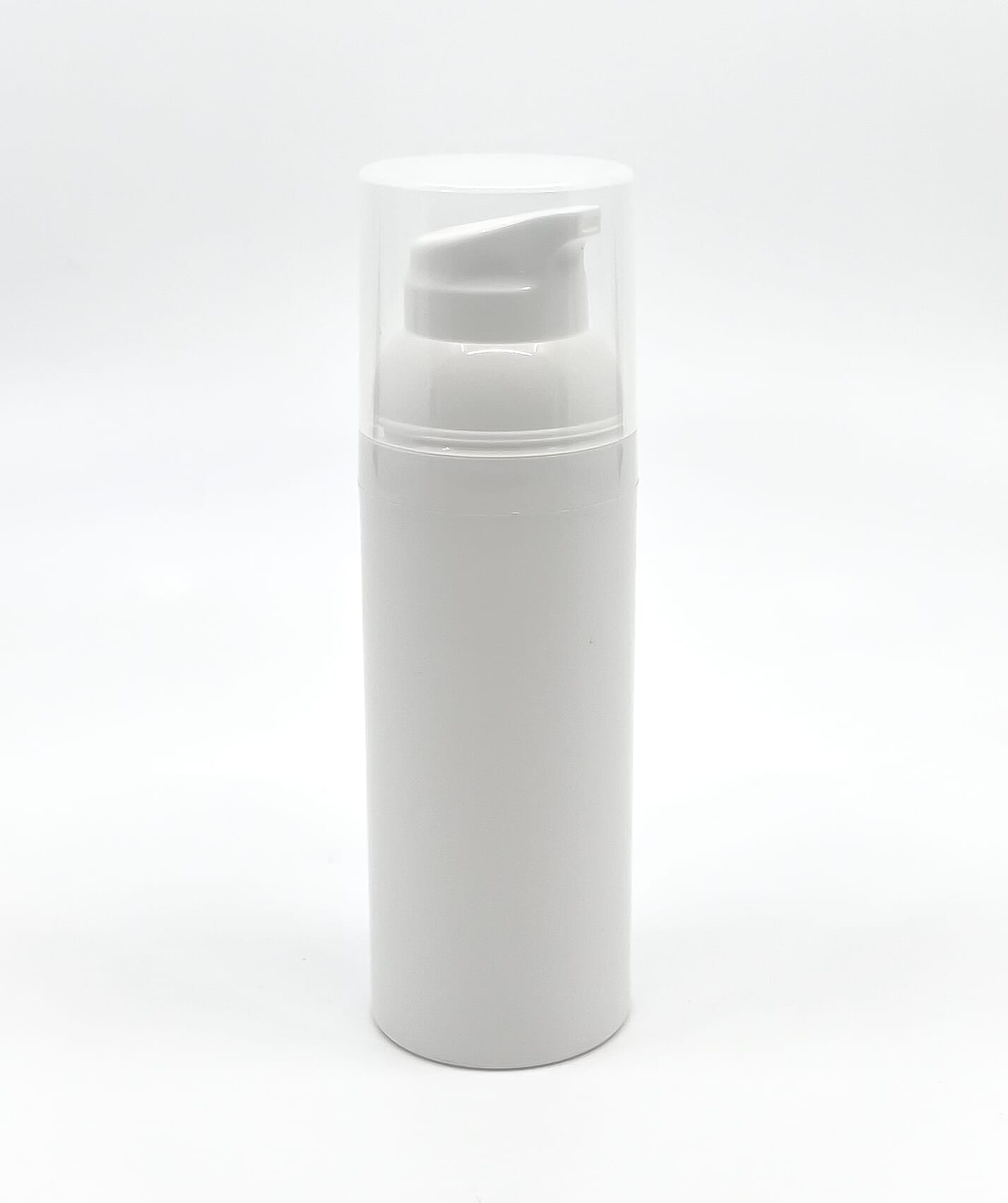 Flaske i hvit plast med airless funksjon inkl. lokk i klar plast.