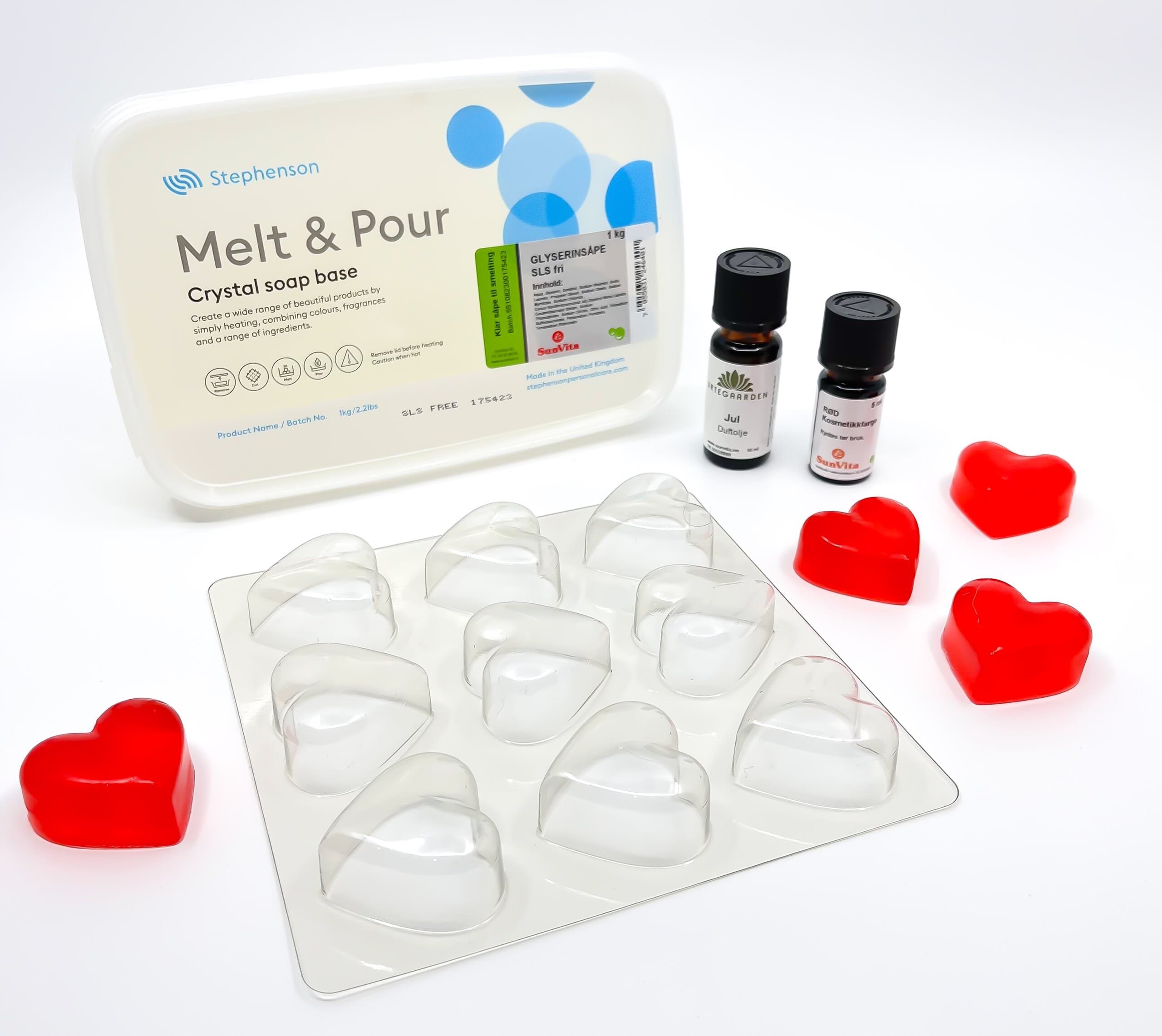 Pakken inneholder: 1 kg glyserinsåpe klar, 1 plast såpeform med 9 stk små hjerter, 5 ml såpefarge rød, 10 ml duftlolje Jul, en velduftende juleblanding av økologisk eterisk appelsinolje, kryddernellikeolje og kanelbarkolje, samt veiledning.